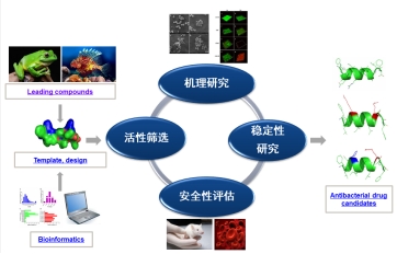 团队研究立足于海南丰富的陆生及海洋动物资源,构建海南两栖动物及热带海洋生物天然生物活性肽功能基因库,筛选具有抗菌,抗炎,抗氧化活性多肽,并以天然活性肽为模板,利用生物信息学大数据分析,将天然多肽模板法与序列模板法相结合,对生物活性肽进行优化与功能设计。以揭示活性多肽的结构和功能关系,及生理、毒理和药理活性。并应用于活性多肽效应分子为基础的药物研究与开发,致力于发现有重要学术价值和应用前景的新药先导分子。先后承担国家自然科学基金等各类科研项目10 余项,发表科研论文50余篇,出版 搜同